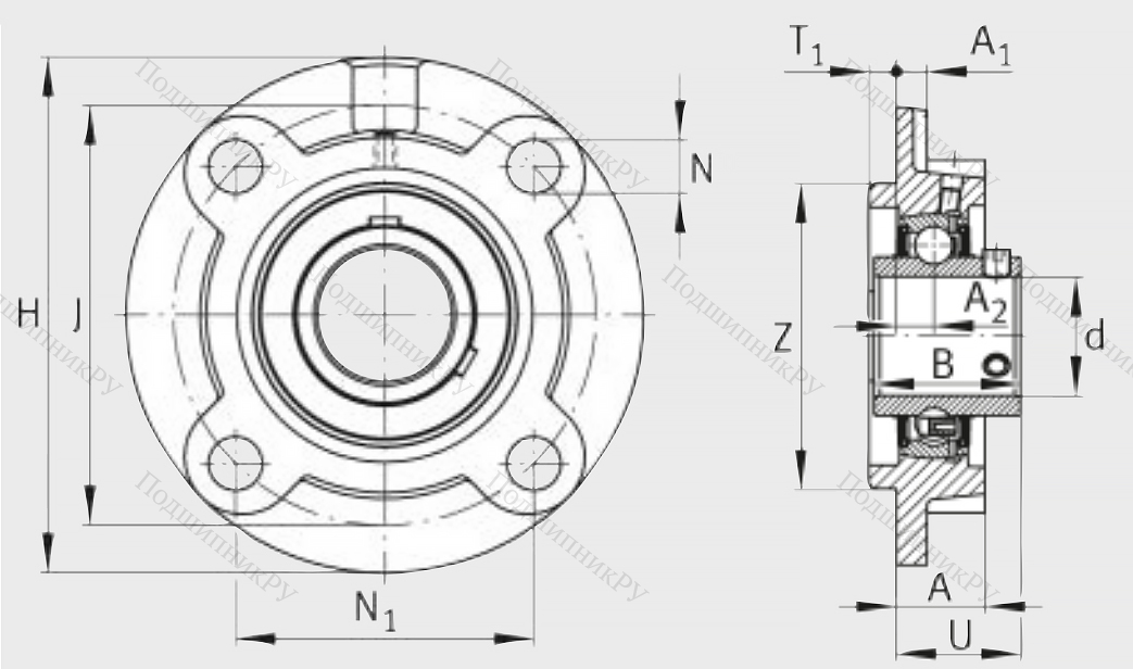 Фланцевая гильза из чугуна или стали оснащена корпусным радиальным шарикоподшипником UC-серии, имеющим внутреннюю обойму удлиненного вида и винтовой стопорной крепеж. Монтаж детали осуществляется методом подгонки.
